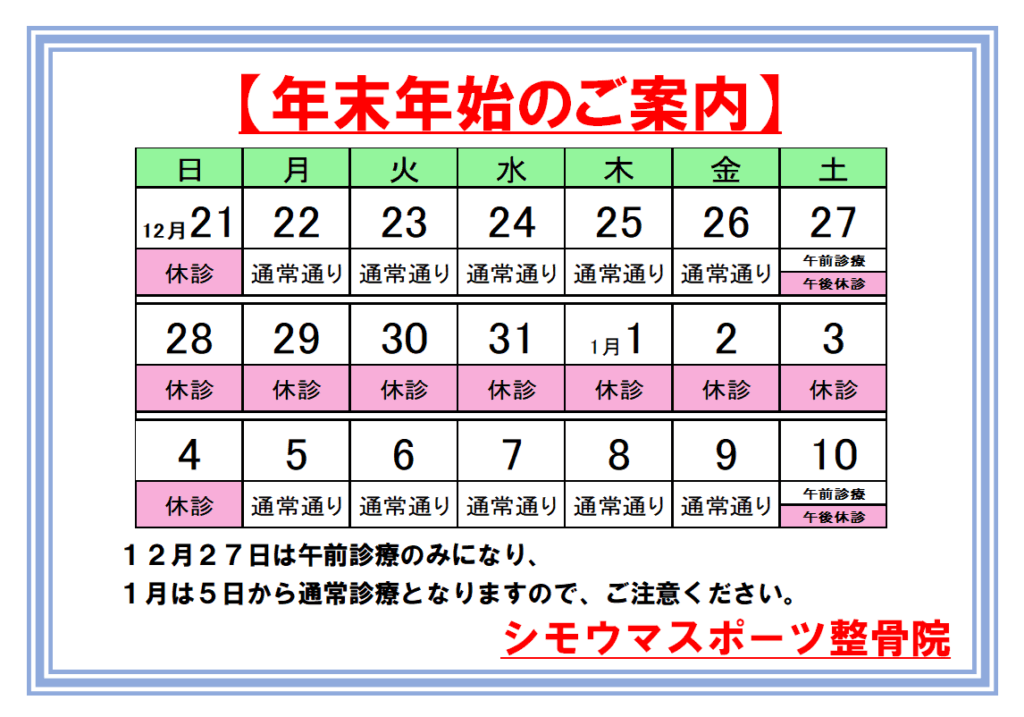 当院の年末年始の診療につきまして、下記の通り休診とさせていただきます。ご不便をおかけいたしますが、よろしくお願いします。
